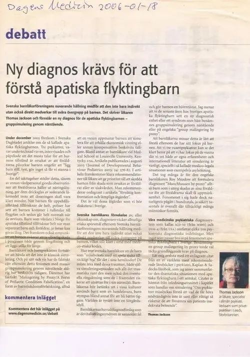 Dr Jackson blev rikskänd när han år 2006 påtalade att apatiska flyktingbarn är utsatta för tvångssimulering. Kan också kallas kommandosyndromet - barn gör som de blir tillsagda. Debatten blev synnerligen het och enkelspårig eftersom endast högerpartier gav stöd till Dr Jacksons övergreppshypotes. Då övergreppen fortsatte tackade Dr Jackson efter 7 år ja år 2012 till att använda högerpartiers plattformar trots han var med i Folkpartiet Liberalerna. Det fanns helt enkelt ingen annan möjlighet att få ut övergreppen till allmänheten då SVT/SR och svensk media låst sig vid en "berättelse" där vårdnadshavare framställts som oskyldiga.
